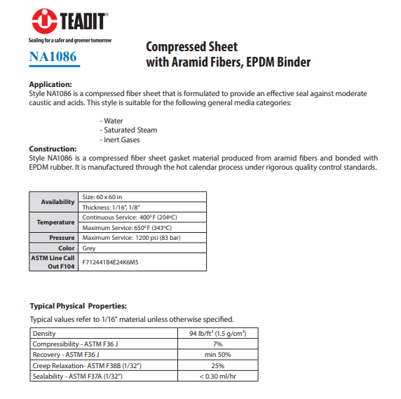 NA1086 型是一種壓縮纖維板,可提供有效的密封,防止中度腐蝕性物質(zhì)和酸性物質(zhì)進(jìn)入。