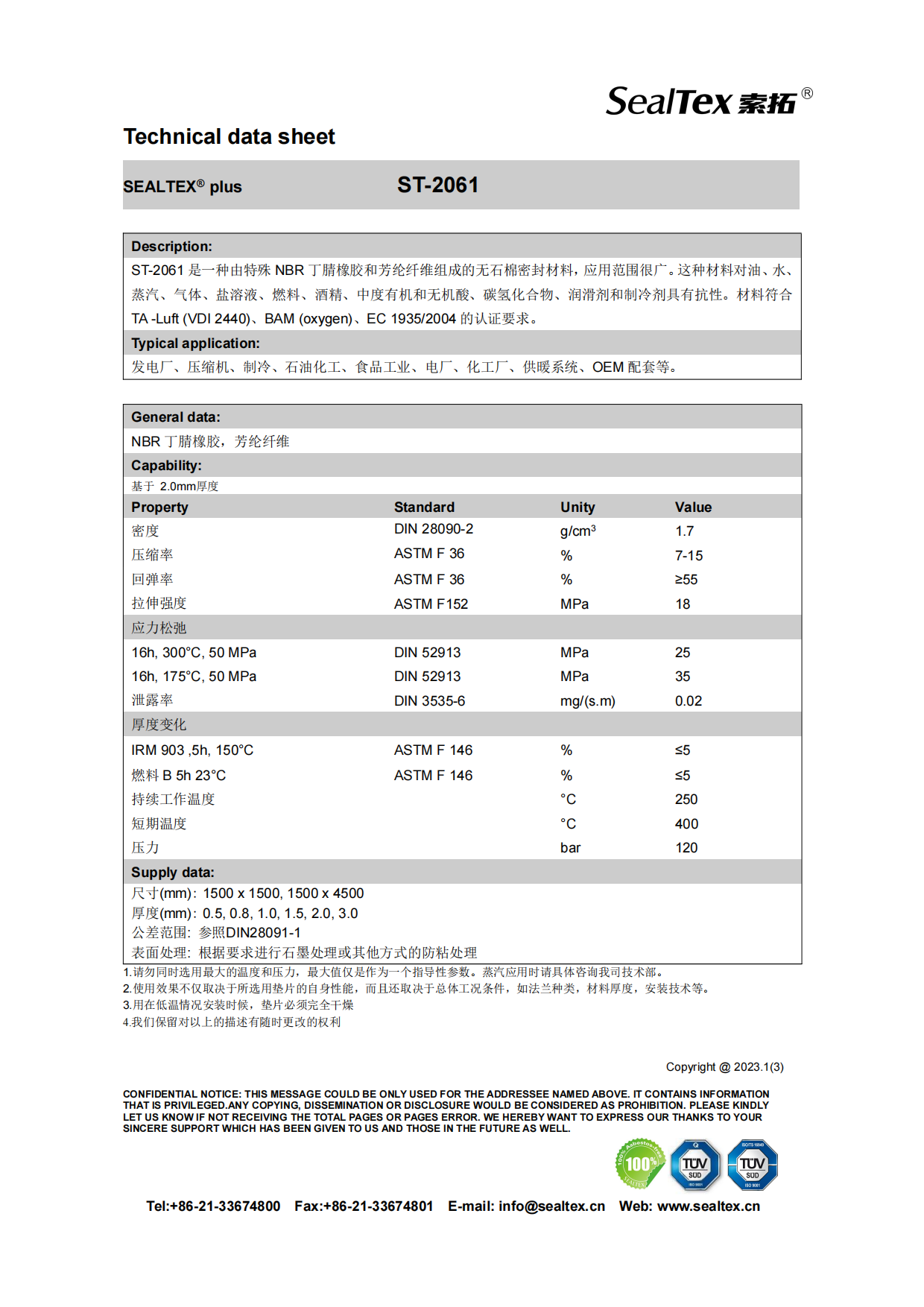 ST-2061 是一種由特殊 NBR 丁腈橡膠和芳綸纖維組成的無石棉密封材料,應(yīng)用范圍很廣。這種材料對油、水、