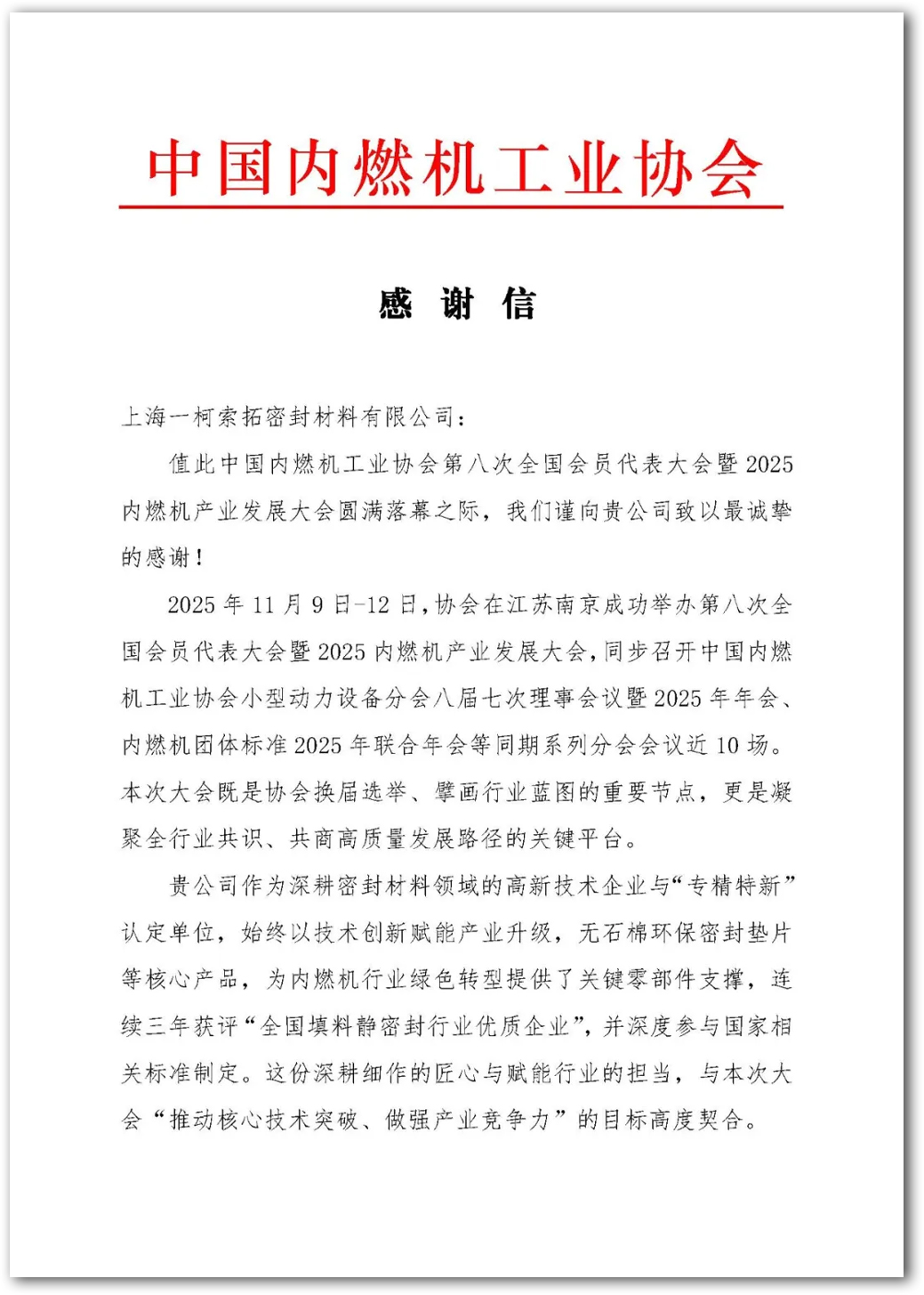 來自中國內燃機工業協會的感謝信 近日,我司收到來自中國內燃機工業協會的感謝信,也借此機會感謝協會的多年信任和支持,作為會員我們一直全力盡責盡職并很榮幸作為其中一員推動協會和行業的發展。并再次祝賀大會的成功召開。 上一個 返回列表 下一個